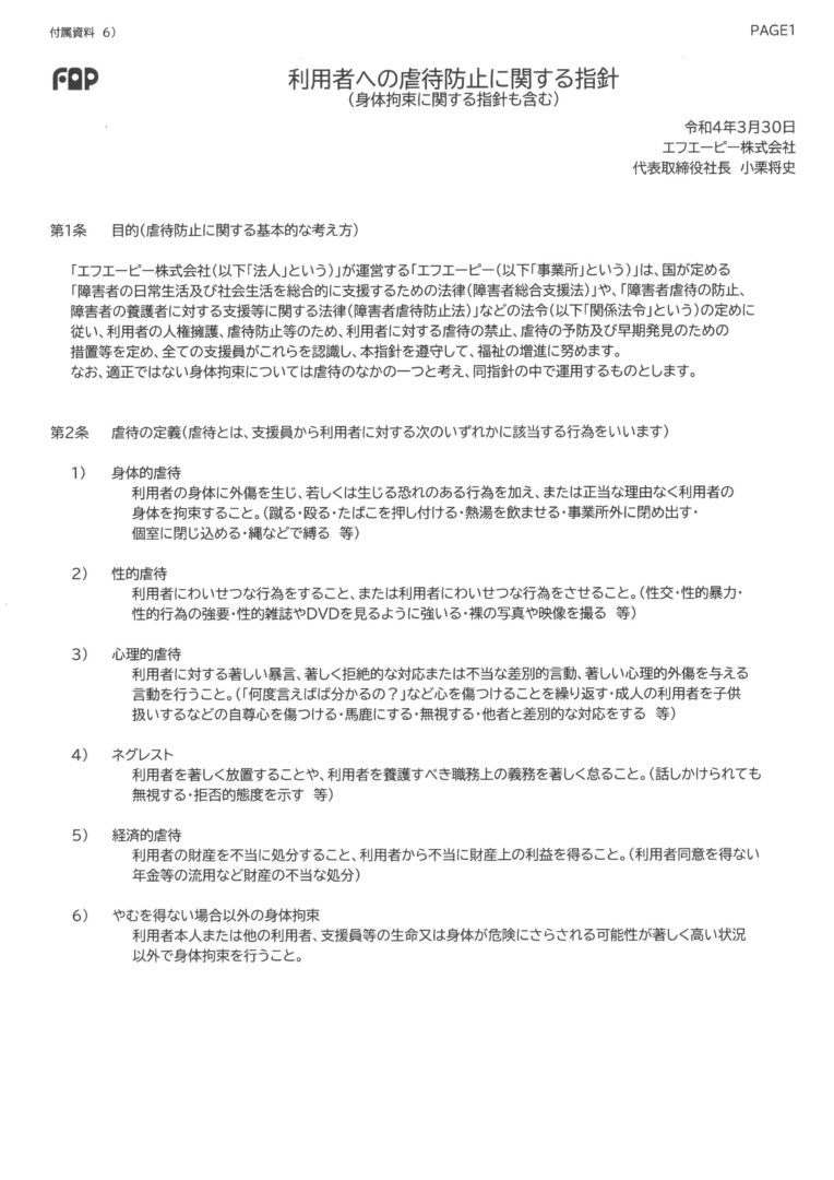 「エフエーピー株式会社(以下「法人」という)が運営する「エフエーピー(以下「事業所」という)」は、国が定める「障害者の日常生活及び社会生活を総合的に支援するための法律(障害者総合支援法)」や、「障害者虐待の防止、障害者の養護者に対する支援等に関する法律(障害者虐待防止法)」などの法令(以下「関係法令」という)の定めに従い、利用者の人権保護、虐待防止等のため、利用者に対する虐待の禁止、虐待の予防及び早期発見のための措置等を定め、全ての支援員がこれらを認識し、本指針を遵守して、福祉の増進に努めます。
